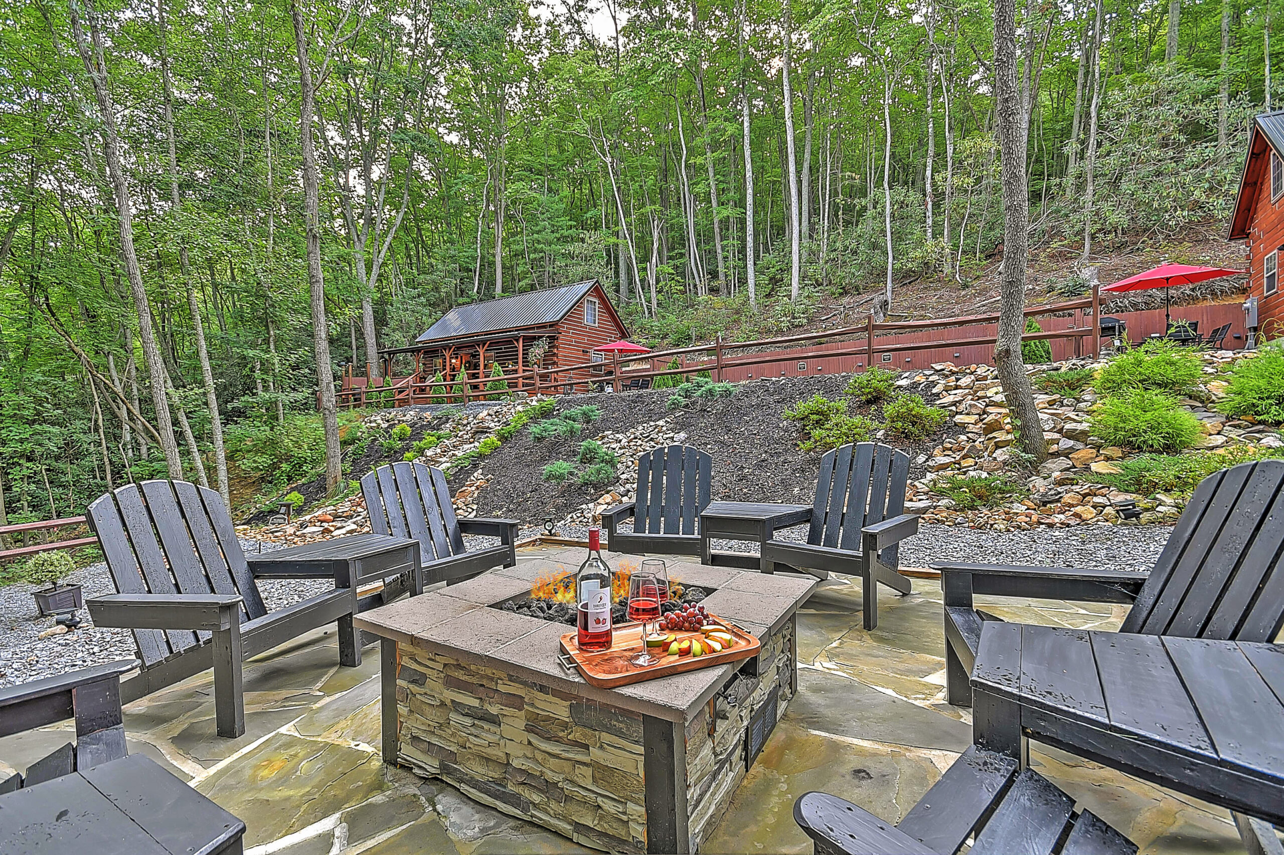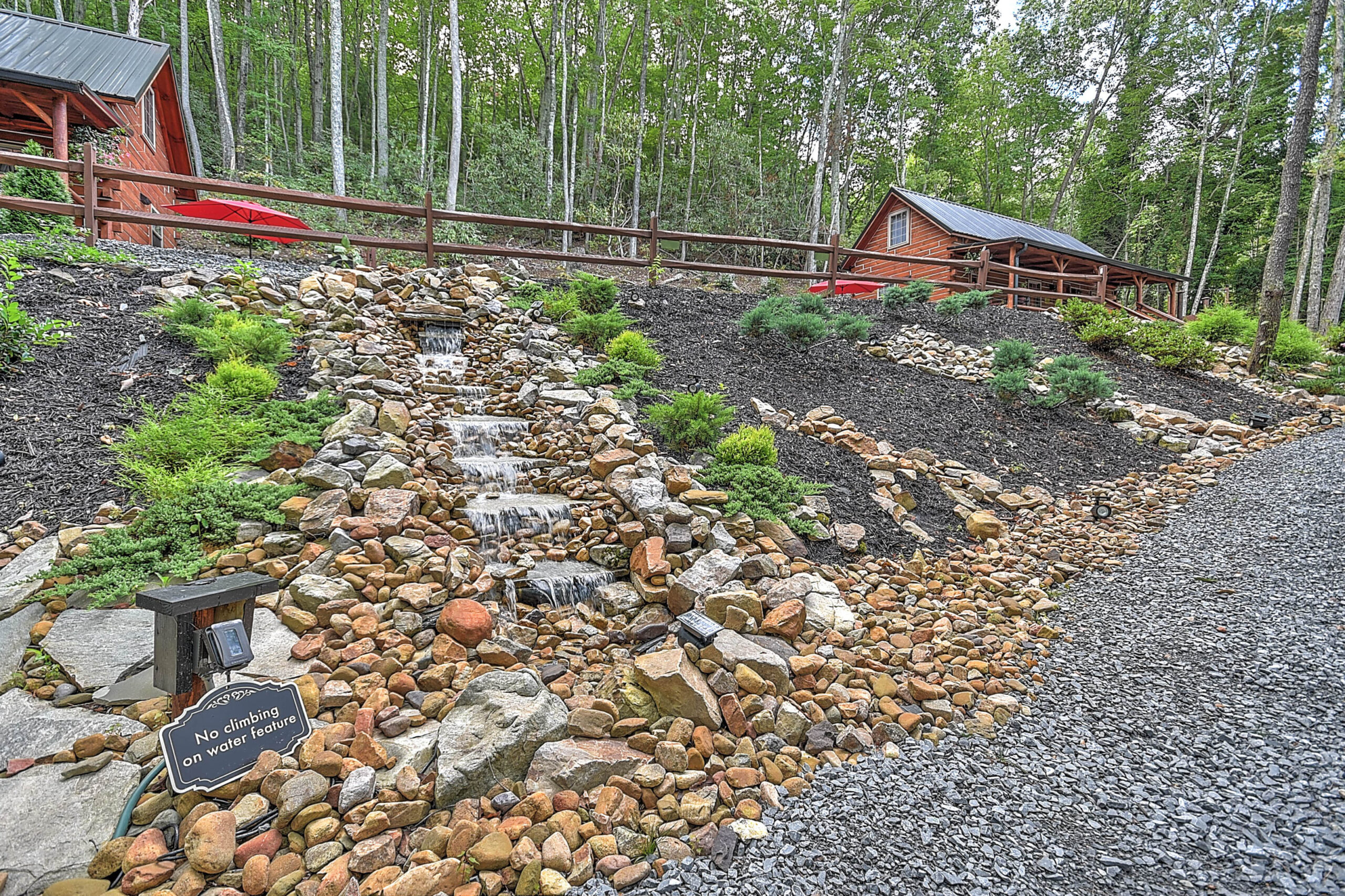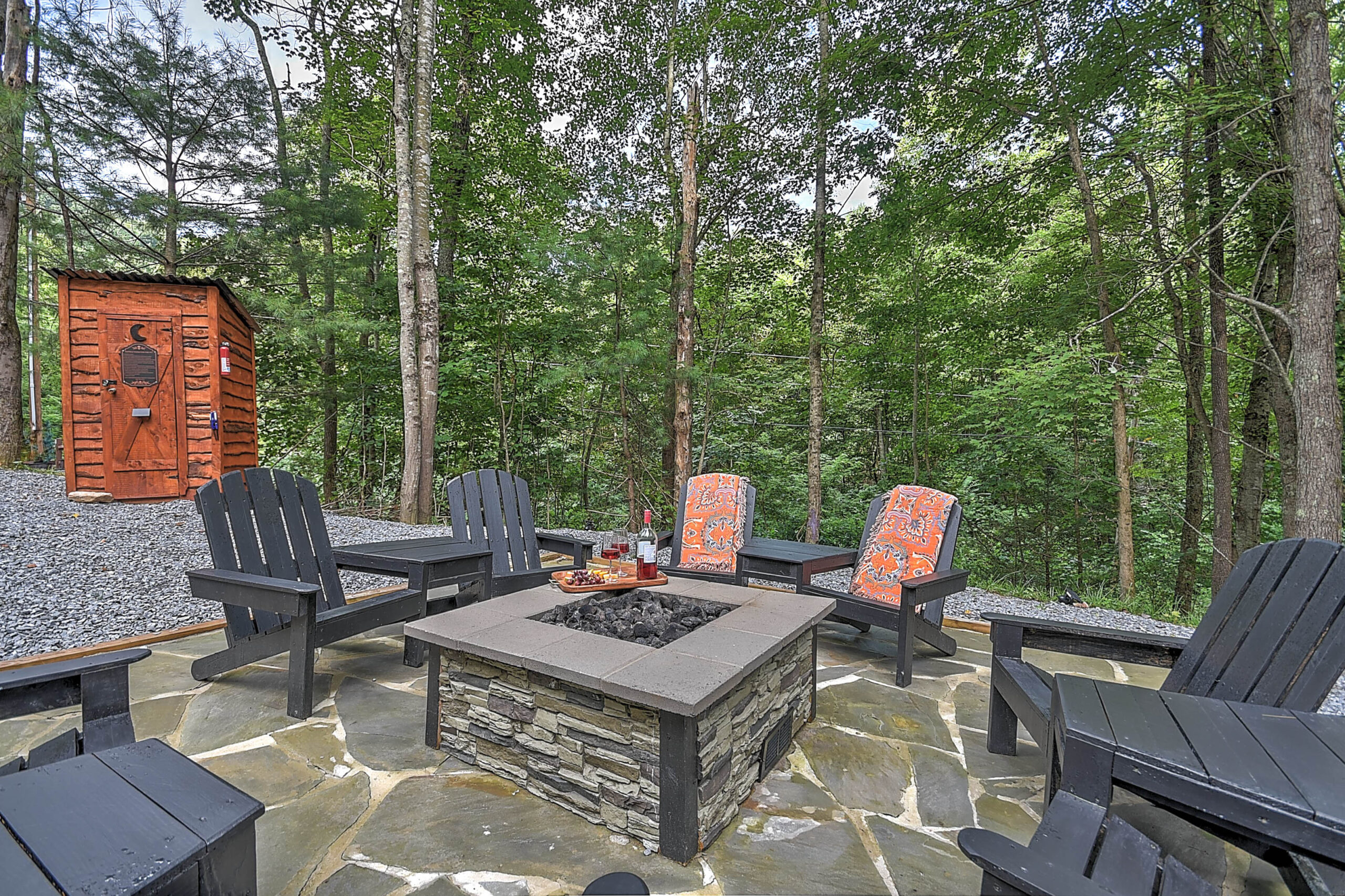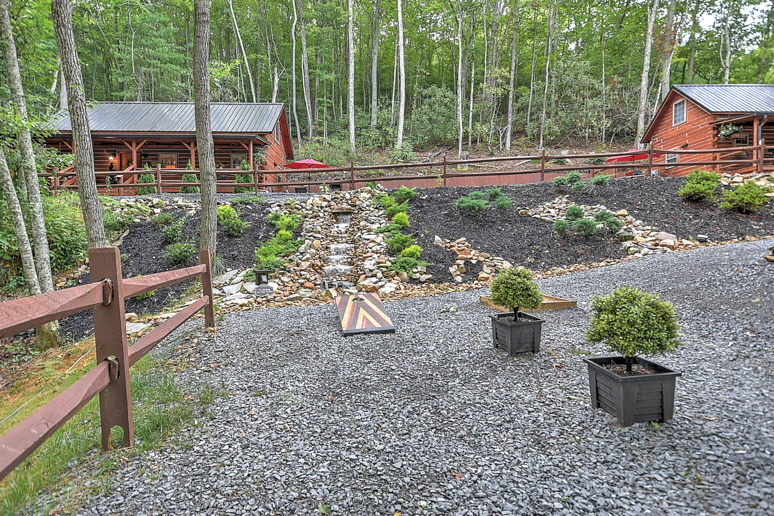 For a bit more space without sacrificing charm, our two-bedroom retreat welcomes families and small groups with a queen bed and two twins, accommodating up to 6. Spend evenings around the outdoor gas firepit, toasting marshmallows under the stars, or relax on the sun terrace with picnic spots for al fresco dining. Inside, discover air-conditioned comfort with smart TVs in every room, a washer/dryer for post-hike convenience, and an Atari gaming nook for rainy days—cornhole and horseshoes await outdoors. The fully stocked kitchen opens to a bright living area, while the 30-foot water feature adds a serene touch to the wooded landscape. Furry guests will enjoy the expansive dog-friendly trails right on property.