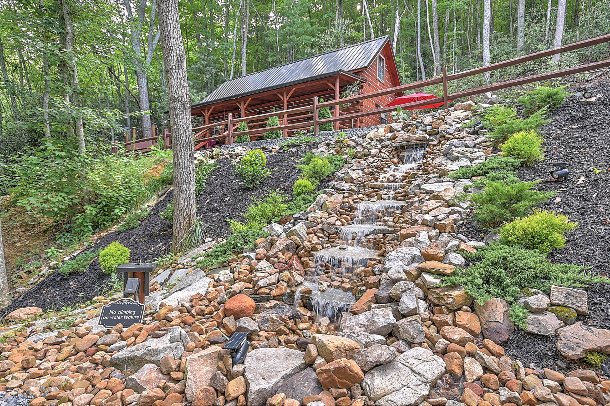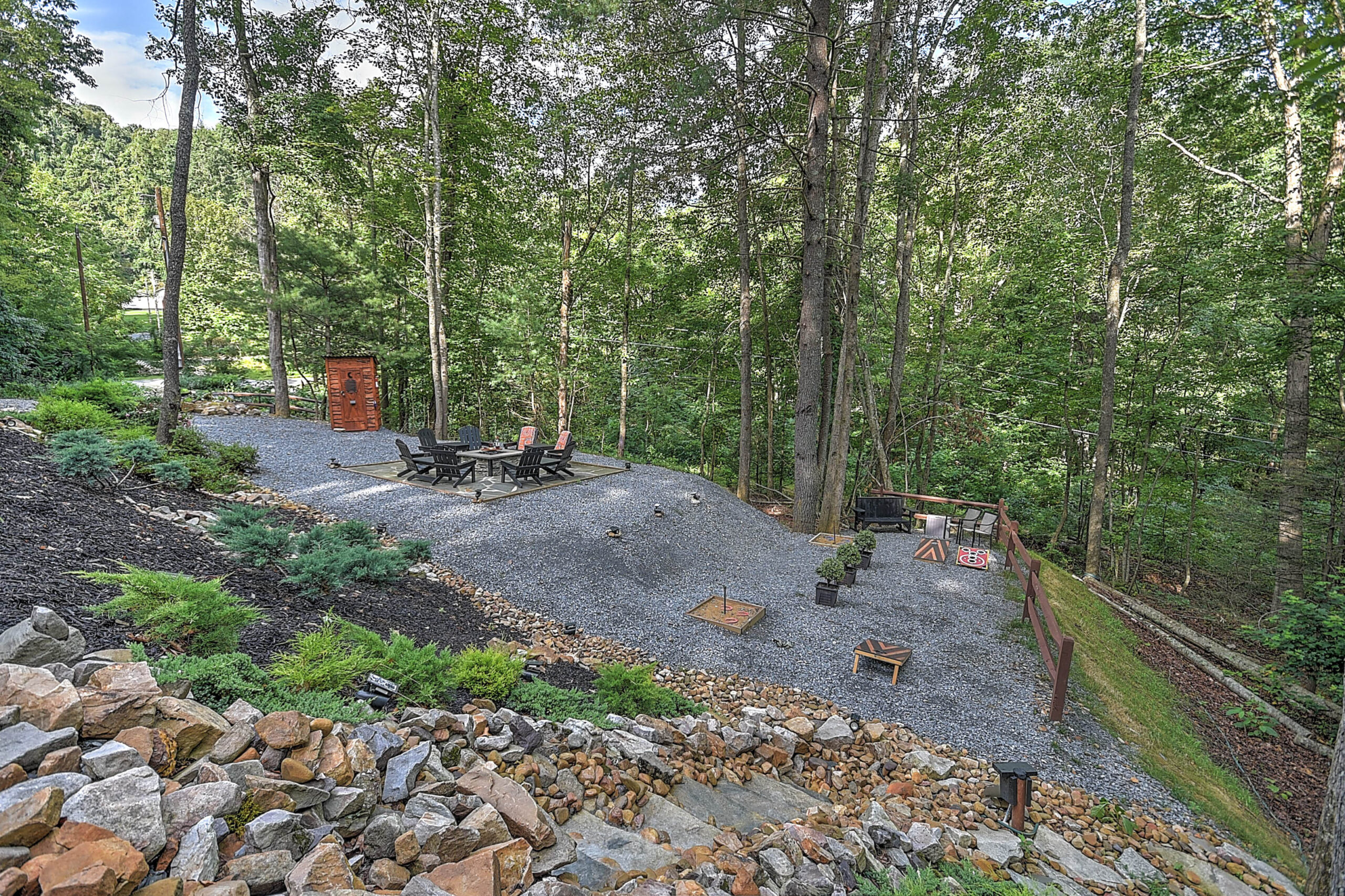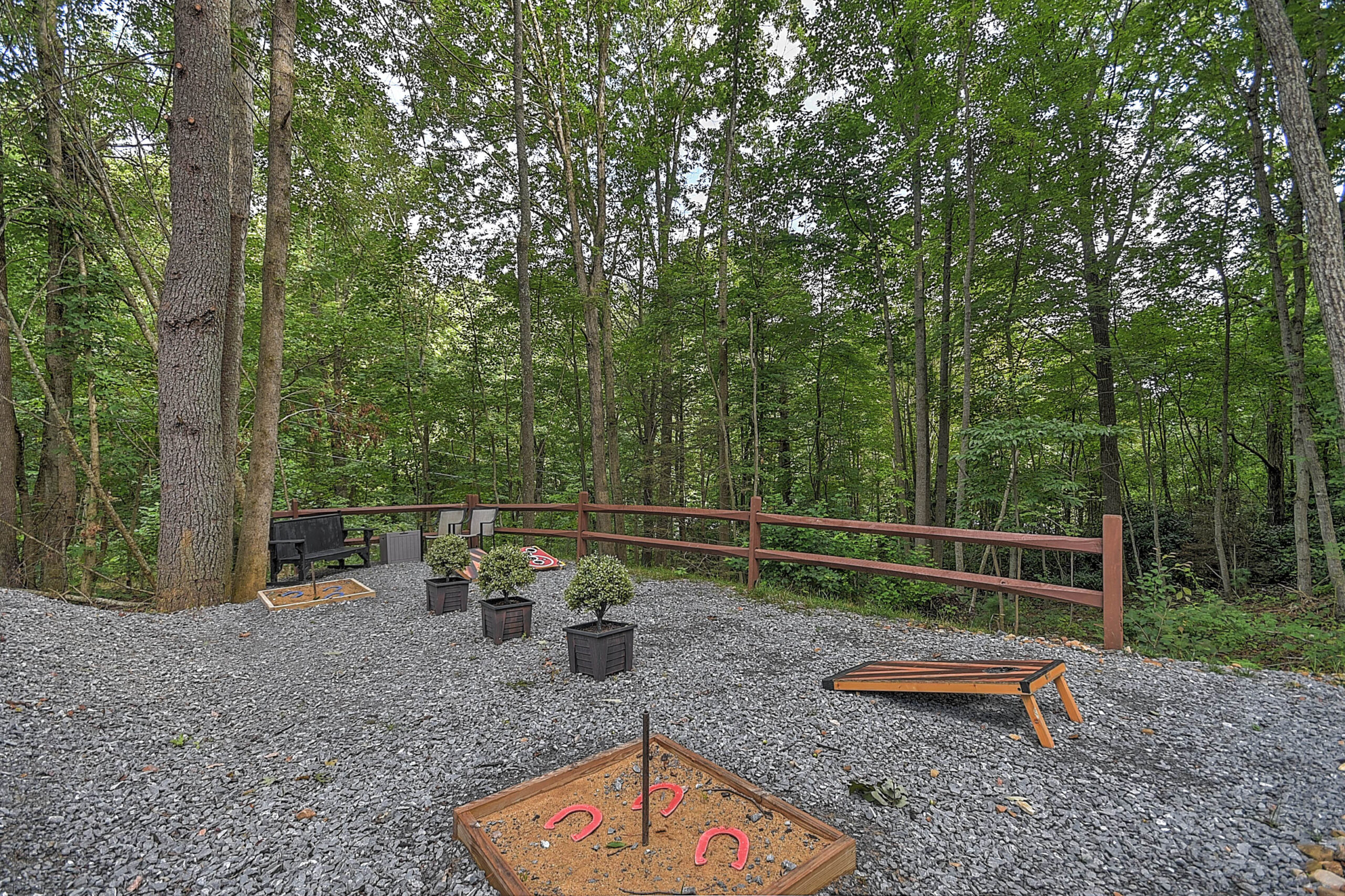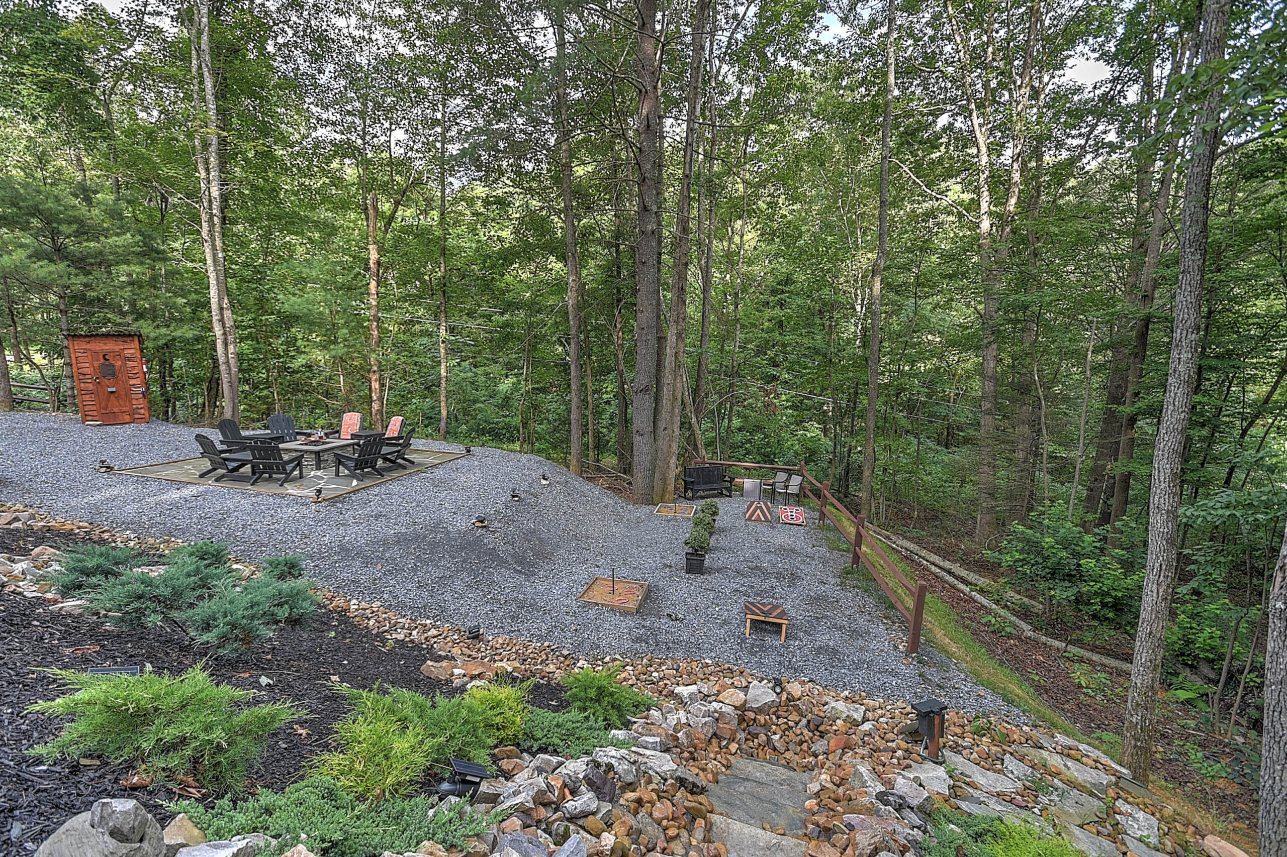 For a bit more space without sacrificing charm, our two-bedroom retreat welcomes families and small groups with a queen bed and two twins, accommodating up to 6. Spend evenings around the outdoor gas firepit, toasting marshmallows under the stars, or relax on the sun terrace with picnic spots for al fresco dining. Inside, discover air-conditioned comfort with smart TVs in every room, a washer/dryer for post-hike convenience, and an Atari gaming nook for rainy days—cornhole and horseshoes await outdoors. The fully stocked kitchen opens to a bright living area, while the 30-foot water feature adds a serene touch to the wooded landscape. Furry guests will enjoy the expansive dog-friendly trails right on property.