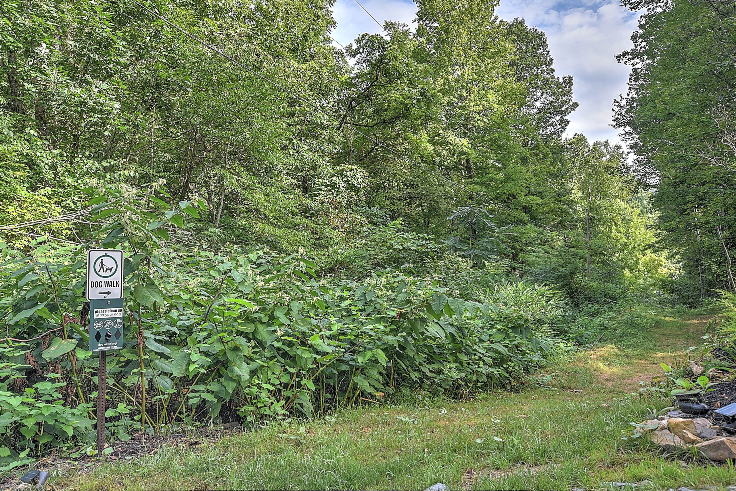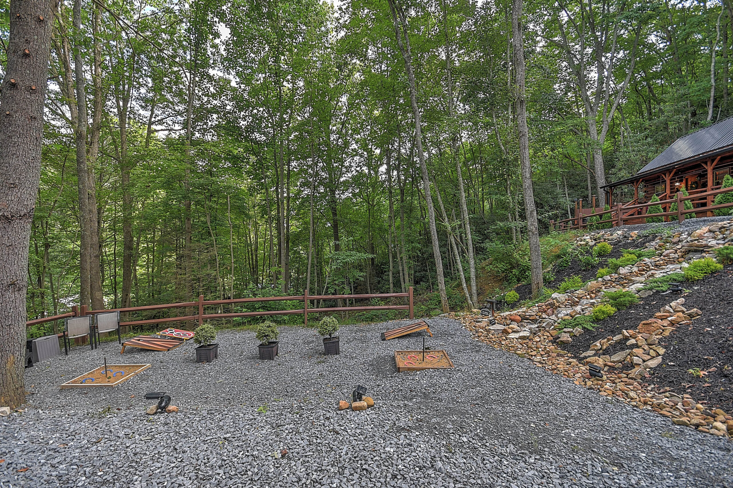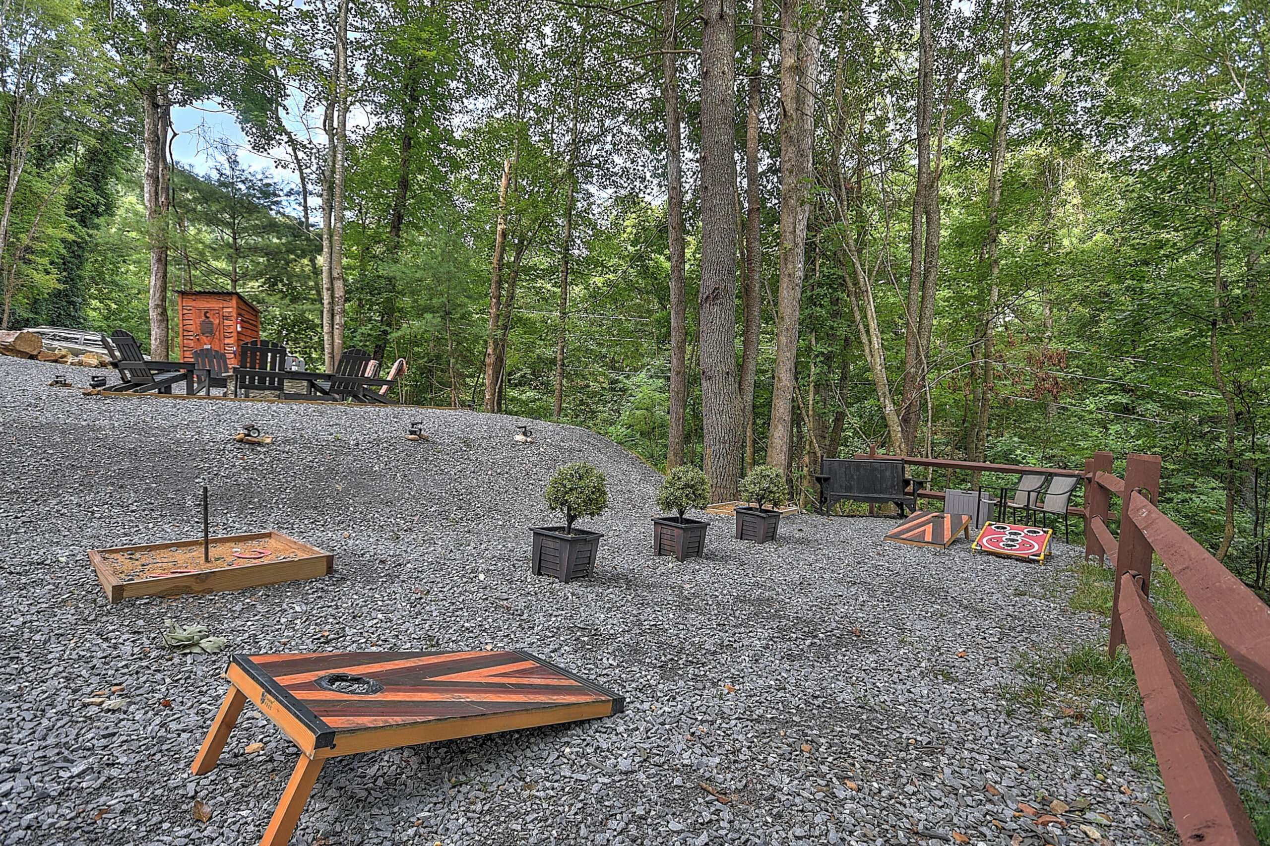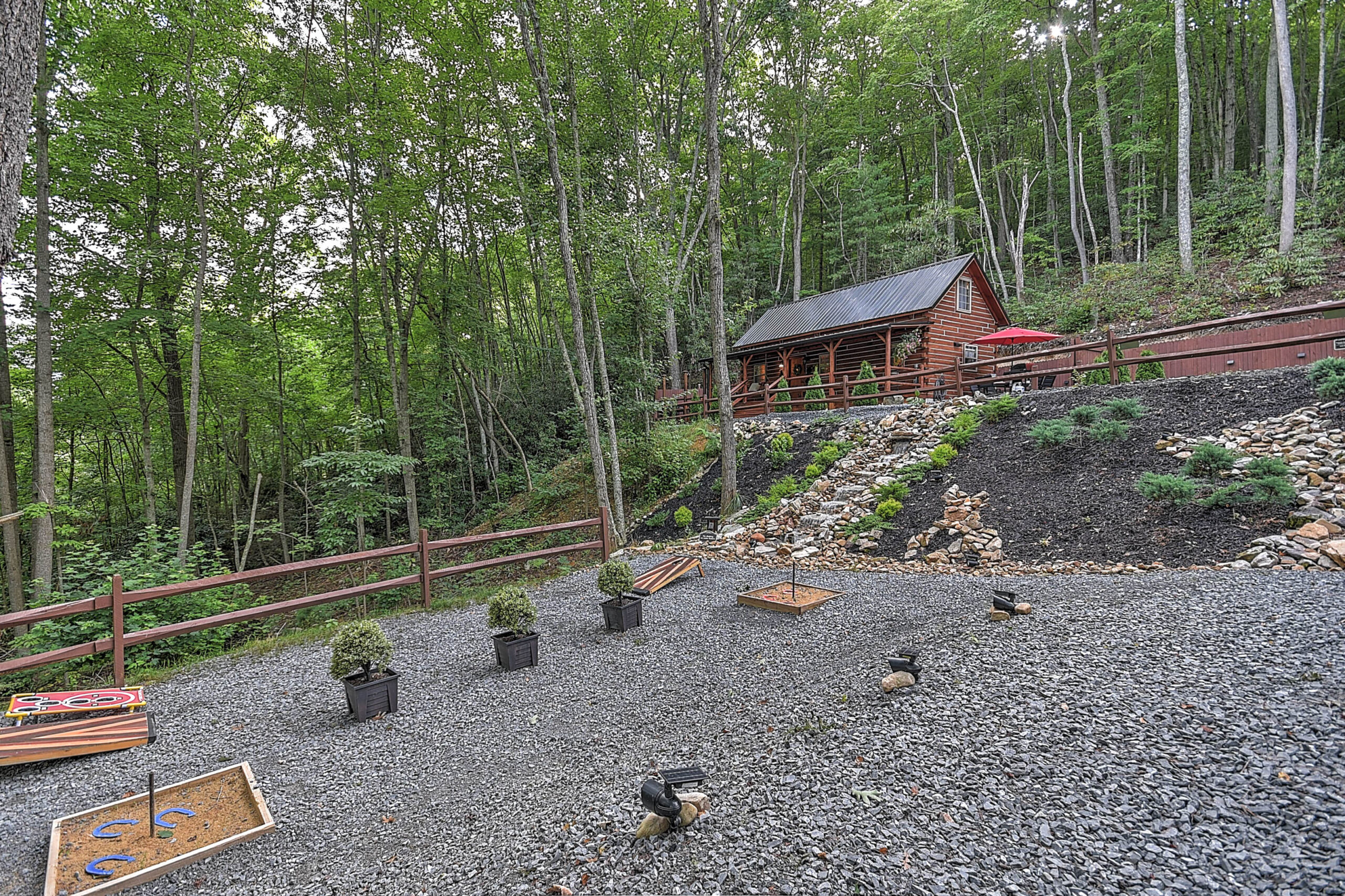 For a bit more space without sacrificing charm, our two-bedroom retreat welcomes families and small groups with a queen bed and two twins, accommodating up to 6. Spend evenings around the outdoor gas firepit, toasting marshmallows under the stars, or relax on the sun terrace with picnic spots for al fresco dining. Inside, discover air-conditioned comfort with smart TVs in every room, a washer/dryer for post-hike convenience, and an Atari gaming nook for rainy days—cornhole and horseshoes await outdoors. The fully stocked kitchen opens to a bright living area, while the 30-foot water feature adds a serene touch to the wooded landscape. Furry guests will enjoy the expansive dog-friendly trails right on property.